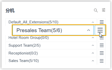 分机 区域按分机组或部门展示分机信息及其实时状态,帮助你快速了解分机用户的工作状态。
