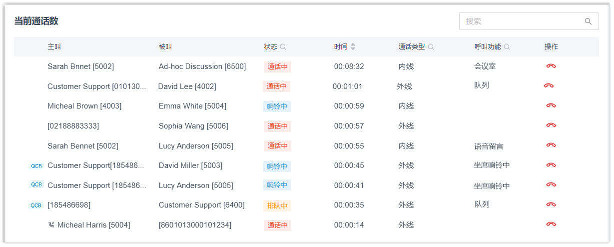 你可以从列表中直观地查看实时通话,包含以下通话信息: