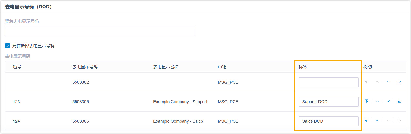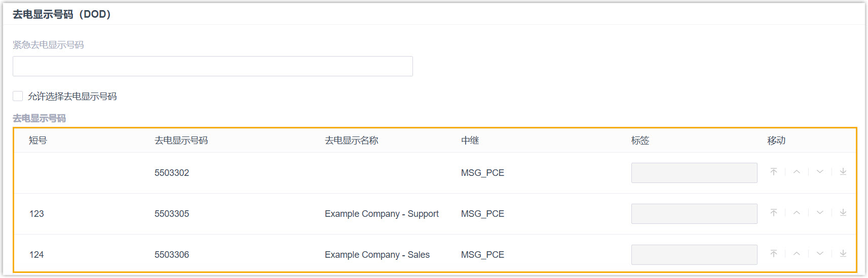 去电显示号码 设置要在被叫的设备上显示的去电显示号码 (DOD)。 去电显示名称 可选。设置要在被叫的设备上与去电显示号码一起显示的名称。 默认标签 可选。设置默认标签,用于识别去电显示号码。 注: 分机用户也可以在其 Linkus 网页端和桌面端上修改去电显示号码的默认标签 (路径:),每位用户自定义的标签仅自己可见。绑定的分机 选择要绑定去电显示号码的分机,授权用户可使用这些号码呼出外线。 - 连续的去电显示号码和连续的分机号一一对应绑定:选择