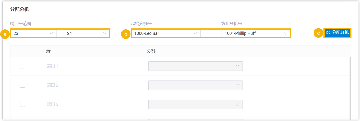 提示: 如果要分配的分机不在列表中,请检查该分机是否已绑定其他话机或网关端口。- 如需解绑分机或网关,请参见 释放绑定在话机/网关上的分机。
