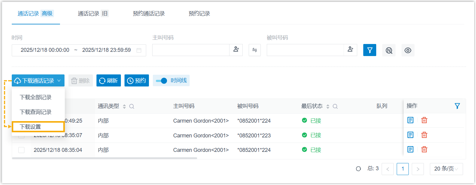 - 在 通话记录 (高级) 页签中,从 下载通话记录