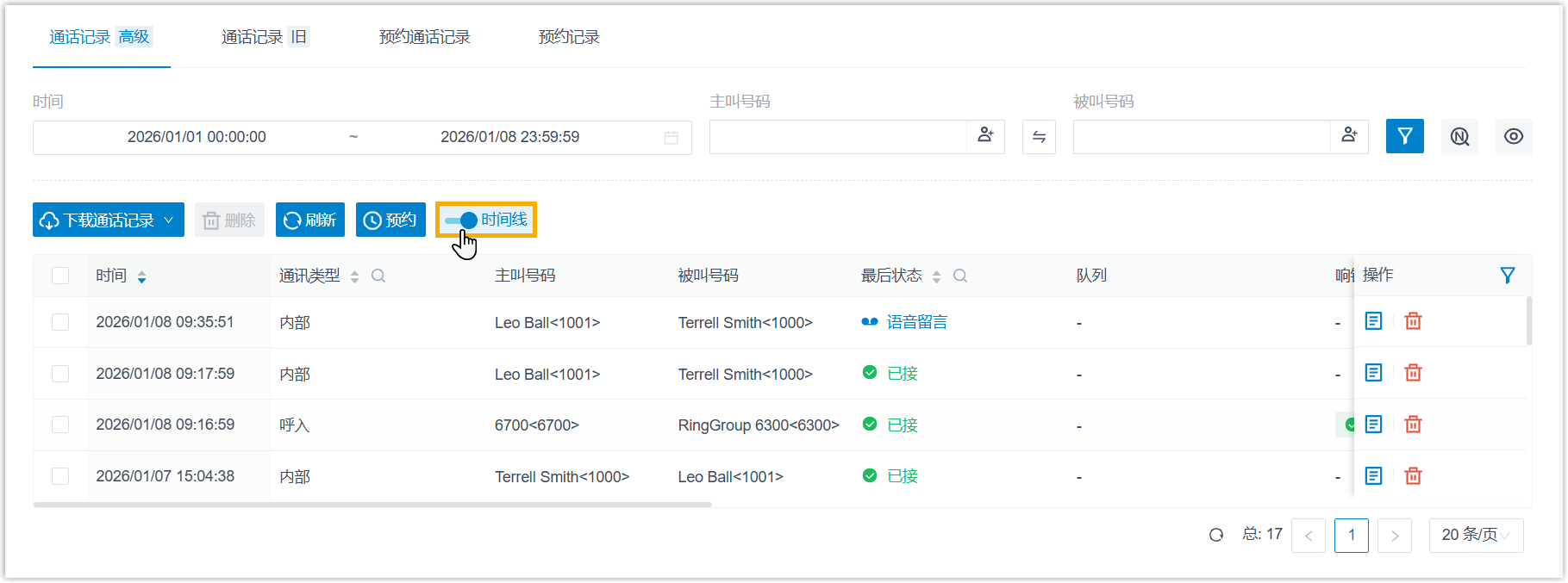 - 在 通话记录 (高级) 页签中,关闭 时间线