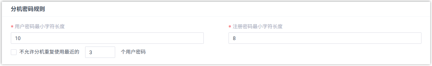 设置 说明 用户密码最小字符长度 指定分机用户密码 (用于登录 Linkus UC 客户端) 的最小字符长度。 注: 最大字符长度为 63 位。注册密码最小字符长度 指定分机注册密码 (用于注册 IP 话机、软电话等终端) 的最小字符长度。 注: 最大字符长度为 63 位。不允许分机重复使用最近的 {number} 个用户密码 启用后,分机用户在修改用户密码时,无法重复使用最近的 {number} 个密码。 你可以设置 1 - 20 之间的数值来指定该数量。