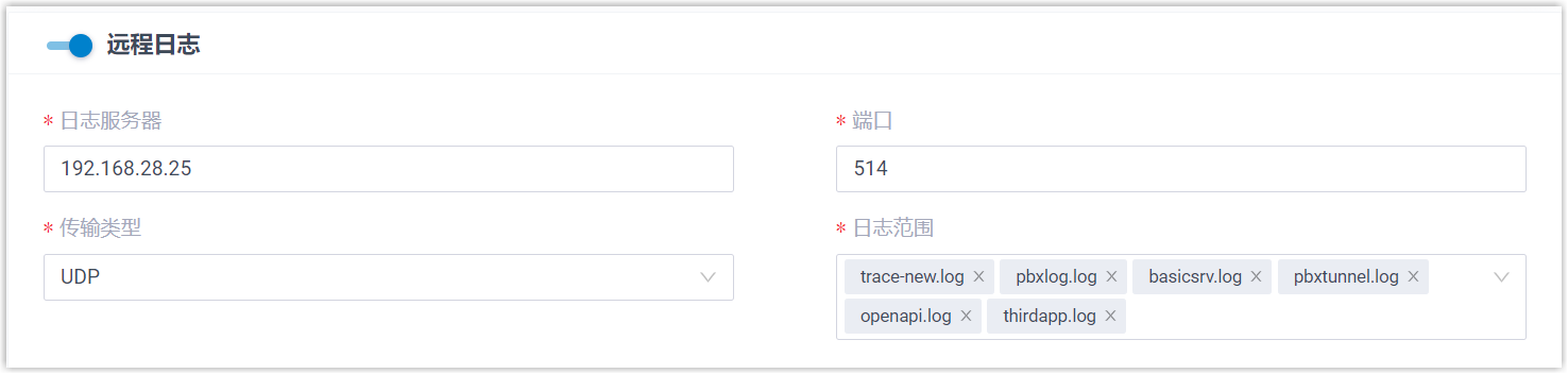 默认情况下,PBX 系统会定期自动删除最早的系统日志。为保证全面记录日志以用于日常故障排除和紧急事件处理,你可以配置 PBX 通过 Syslog 协议,利用 UDP、TCP 或 TLS 传输方式, 将系统日志转发到本地或远程的第三方日志服务器,实现日志的集中记录和长期存储。