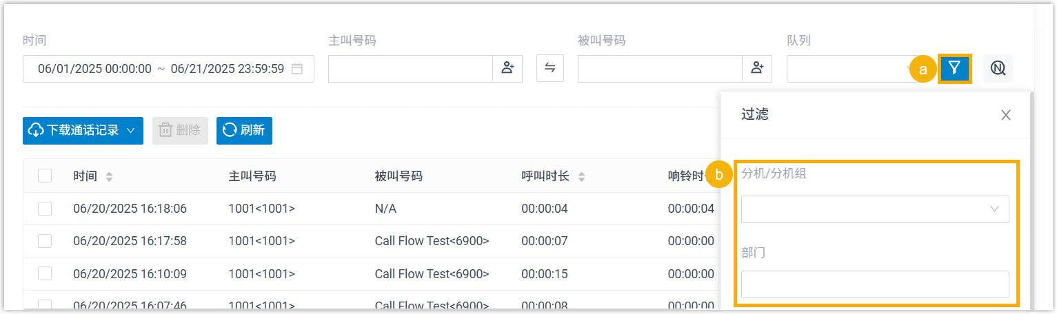 筛选字段 说明 分机/分机组 选择分机或分机组。 系统只查询指定分机的通话。