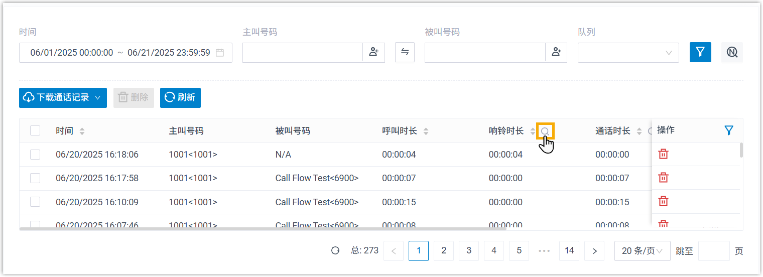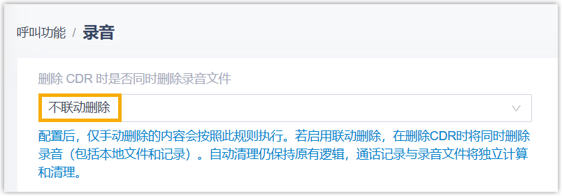 - 勾选要删除的通话记录,点击 删除 并确认操作。注: 默认情况下,系统会同时删除相关录音文件。若只想删除通话记录,可将 删除 CDR 时是否同时删除录音文件 设置为 不联动删除 (路径:)。