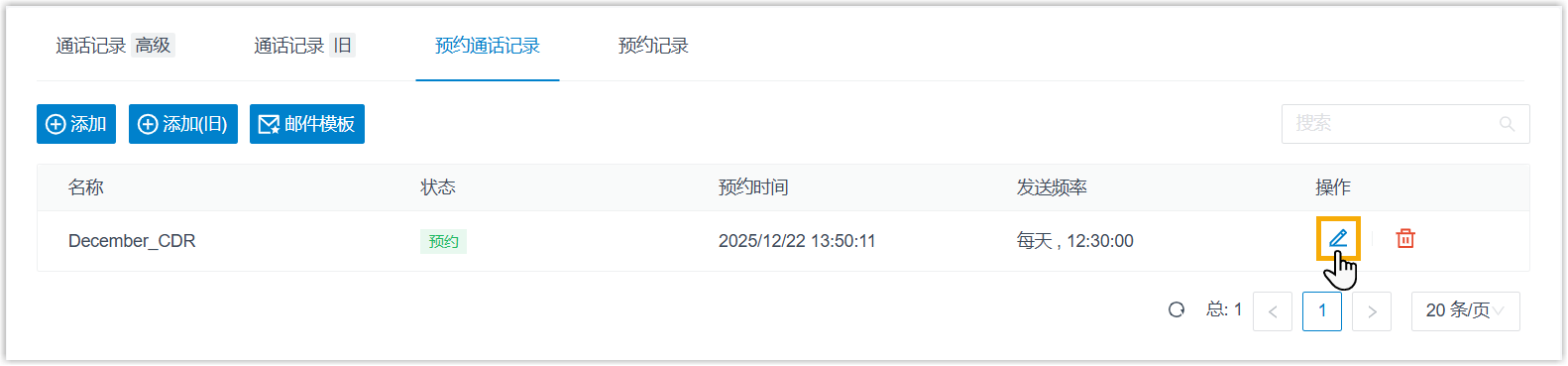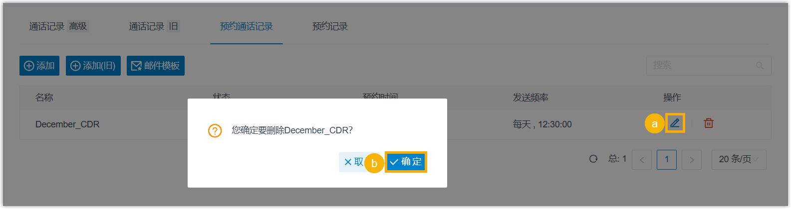 管理预约的通话记录发送任务 本文介绍如何编辑和删除预约的通话记录发送任务。 编辑预约的通话记录发送任务 登录 PBX 管理网页,进入 通话记录和录音 > 通话记录。 在 预约通话记录 页签下,点击发送任务旁边的 。 根据需要,更改发送任务的设置。 点击 保存。 删除预约的通话记录发送任务 登录 PBX 管理网页,进入 通话记录和录音 > 通话记录。 在 预约通话记录 页签下,执行以下操作: 点击发送任务旁边的 。 在弹出的窗口中,点击 确定。