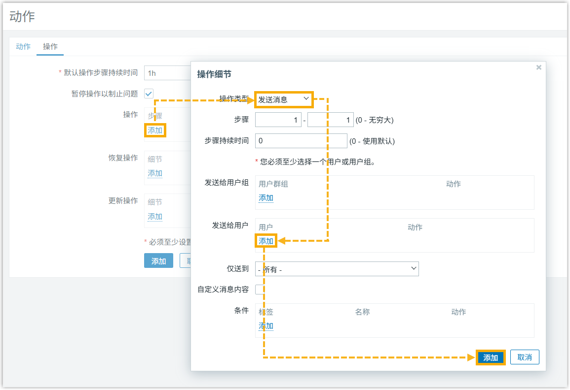 - 在 操作 页签下,点击 添加