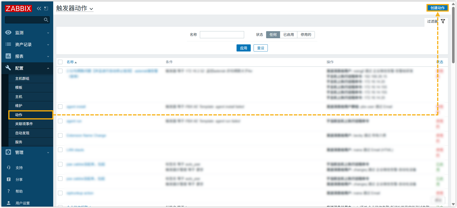 - 在左侧导航栏,点击 动作,接着点击