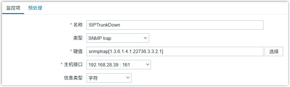 snmptrap[{snmp_oid}]。在本例中,填写 snmptrap[1.3.6.1.4.1.22736.3.3.2.1]。 - 信息类型:选择信息类型。在本例中,选择 字符。
