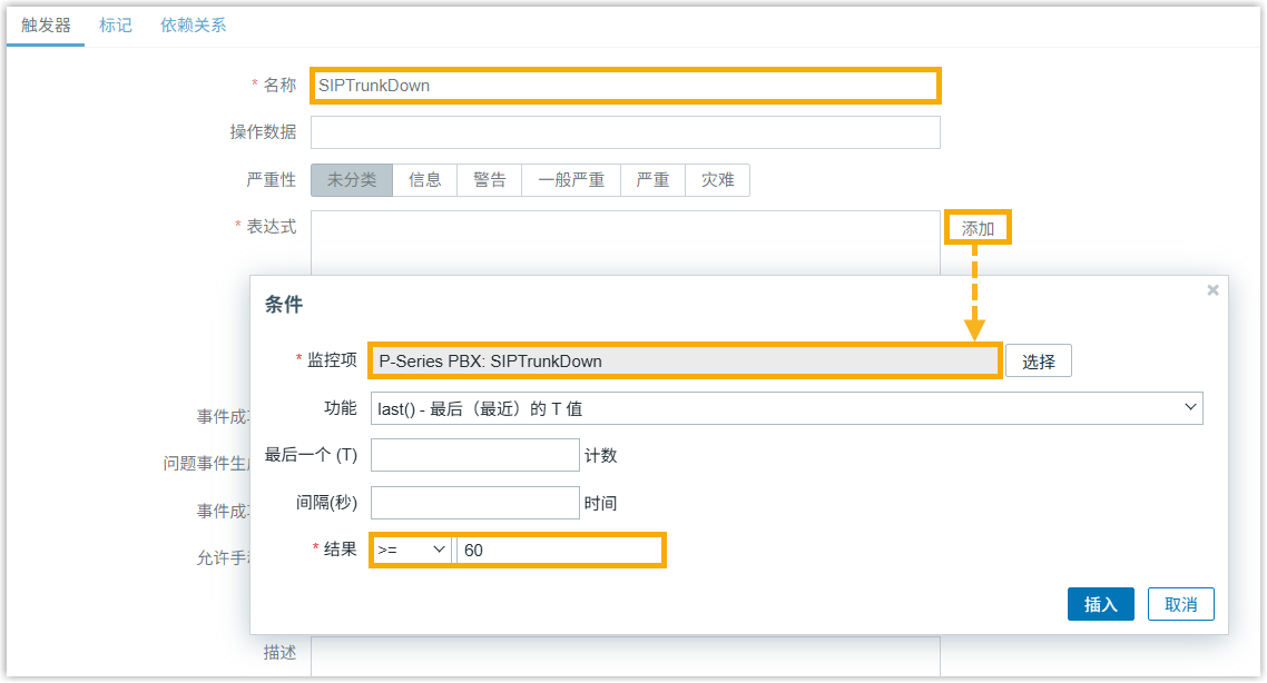 - 名称:填写一个名称,帮助你识别此监控项。在本例中,填写 SIPTrunkDown.
