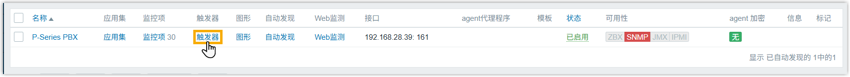 在 主机 列表,可以看到模板及监控项已与 PBX 主机关联成功。