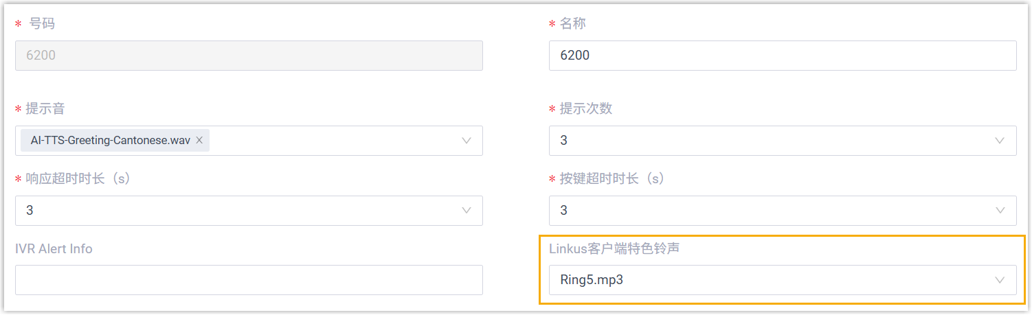 你可以为 IVR 设置特色响铃,当分机用户接收到来自该 IVR 的来电时,其 Linkus 客户端会播放此铃声。