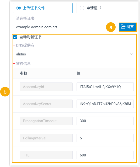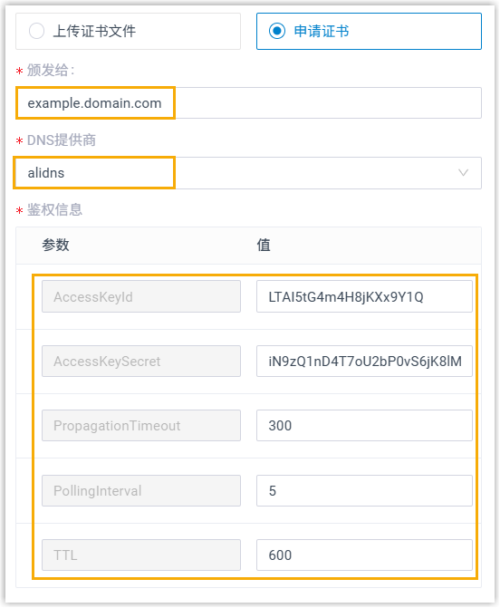 - 鉴权信息:填写必需的鉴权参数的对应值。注: 不同 DNS 提供商鉴权信息不同,关于具体的鉴权参数和信息,请参见 支持的 DNS 提供商。