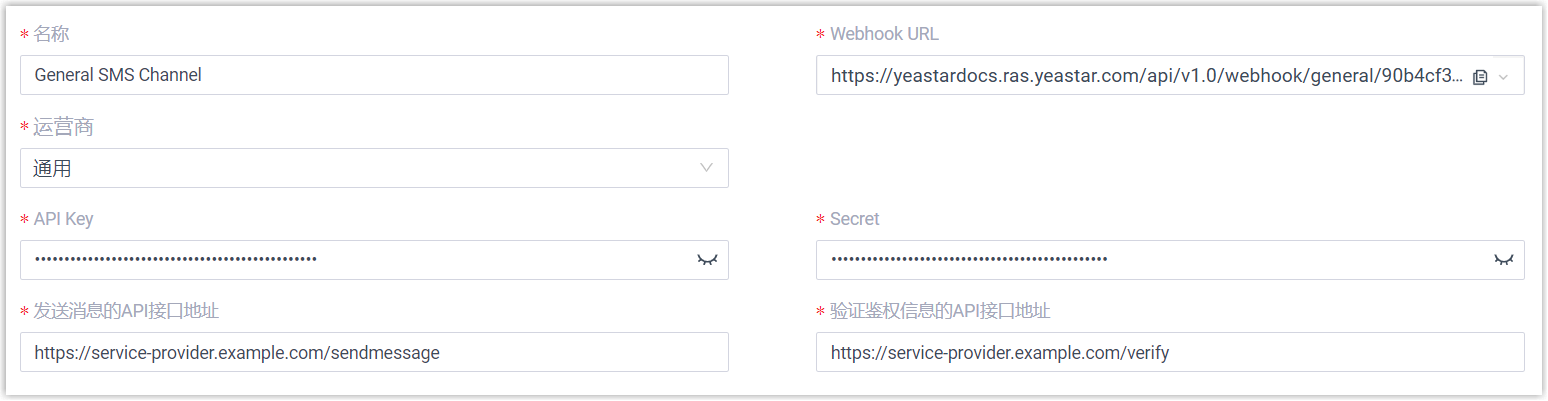 - 发送消息的API接口地址:填写 SMS 运营商提供的 API