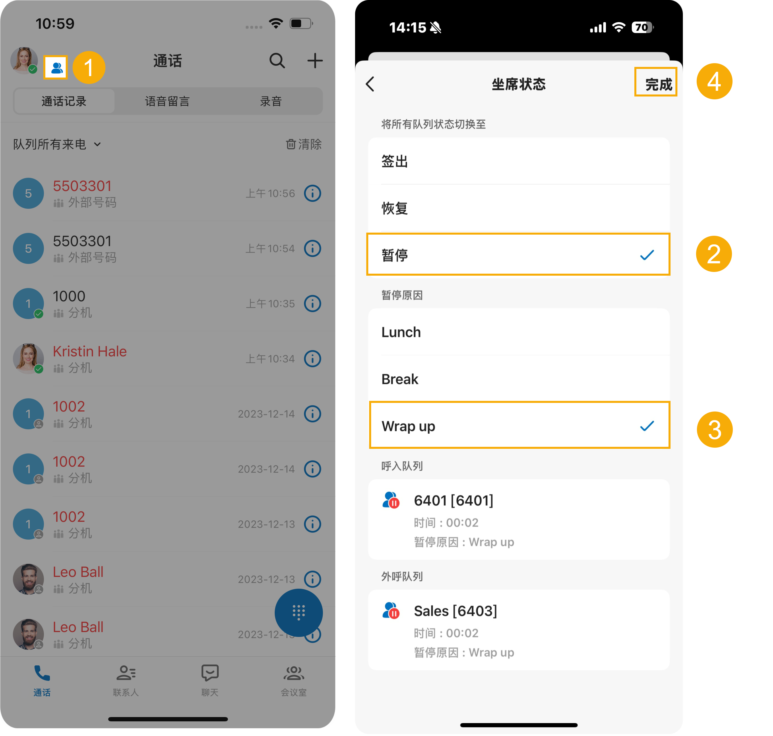 使用特征码暂停接收指定队列来电 - 从系统管理员处获取 暂停/恢复 特征码以及 暂停原因 特征码。