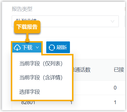 - 选择字段:自定义报告中要包含的字段,然后按需下载列表数据,或同时下载列表数据和队列通话详情。