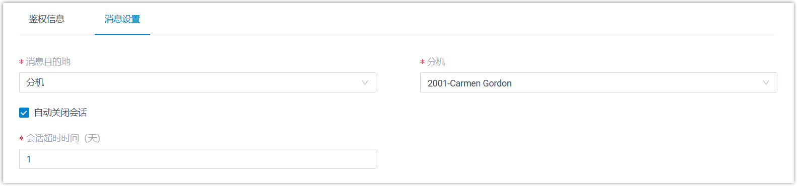 第三方分析平台(消息通过二次开发接口传递) 若选择此项,通过此号码送入的消息会通过 API 转发到第三方消息分析平台进行进一步分析或处理。 注: 要实现入站消息自动转发至第三方消息分析平台,需确保 PBX 系统已经通过 API与第三方消息分析平台对接。选择此选项后,PBX 系统就会自动将收到的消息发送到指定平台。你可以通过监控 API 事件 (30031) 新消息通知获取相关事件通知。此外,PBX 提供了完整的讯息管理 API 接口,可用于与对接的第三方消息分析平台进行进一步的消息交互。 - 自动关闭会话:可选。如果你想要系统自动关闭在指定时间内无任何互动的会话,勾选 自动关闭会话,并在 会话超时时间 (天) 栏中设置超时时间。