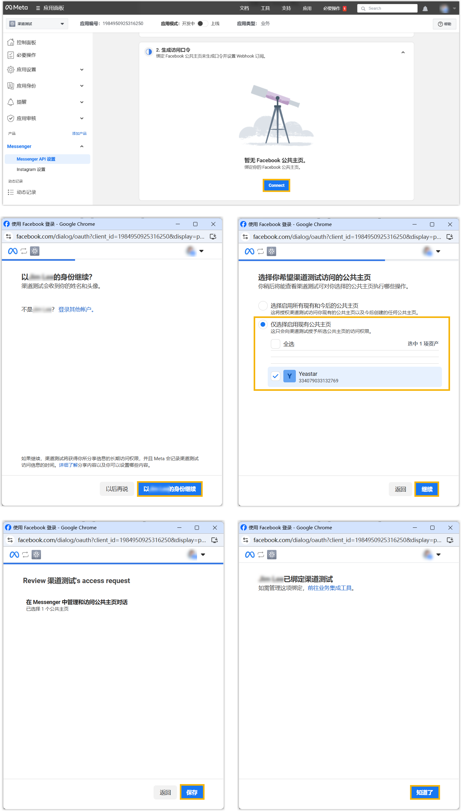 - 将 Meta 应用连接到你的 Facebook 公共主页以生成访问口令,并获取 Facebook 公共主页的凭证。