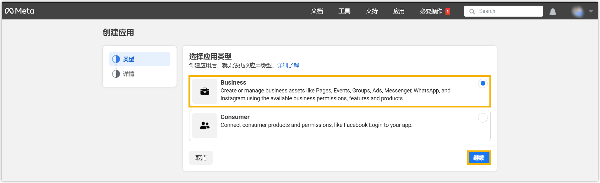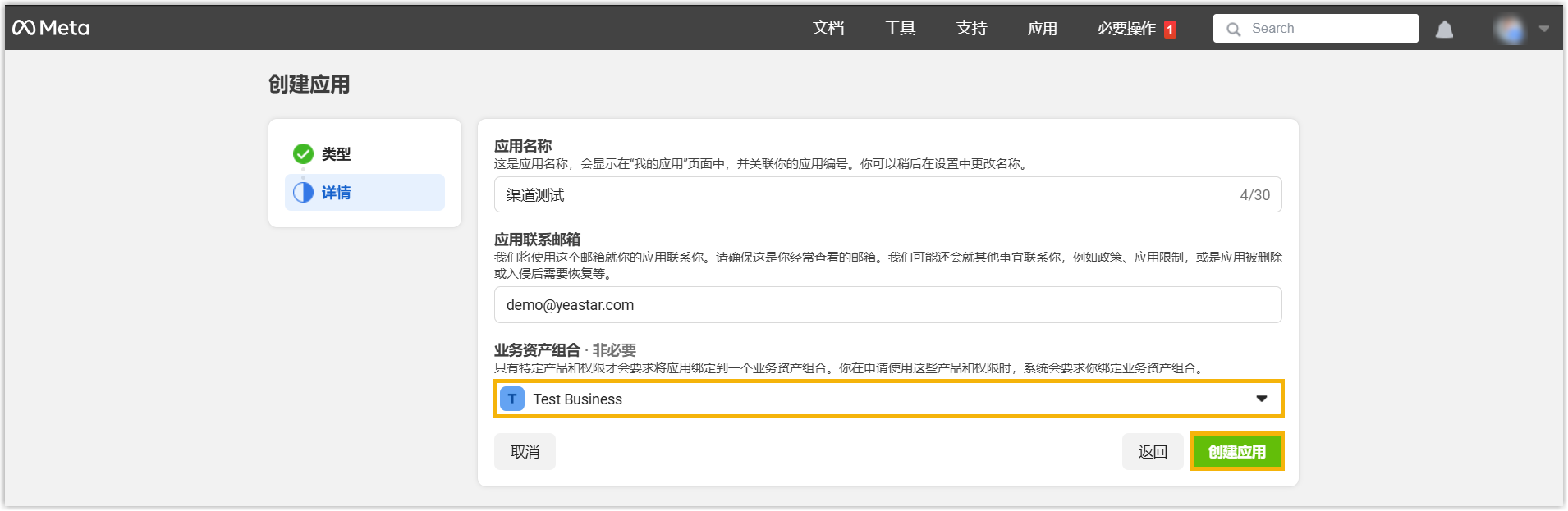 在 Meta 开发者平台,为集成创建一个 Meta 应用。