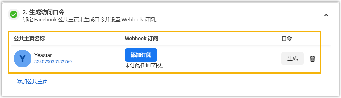 - 生成访问口令以验证 Meta 应用,并允许其以 Facebook 公共主页的身份执行操作。注: 复制并保存访问口令,因为稍后你需要将其添加到 PBX 中。