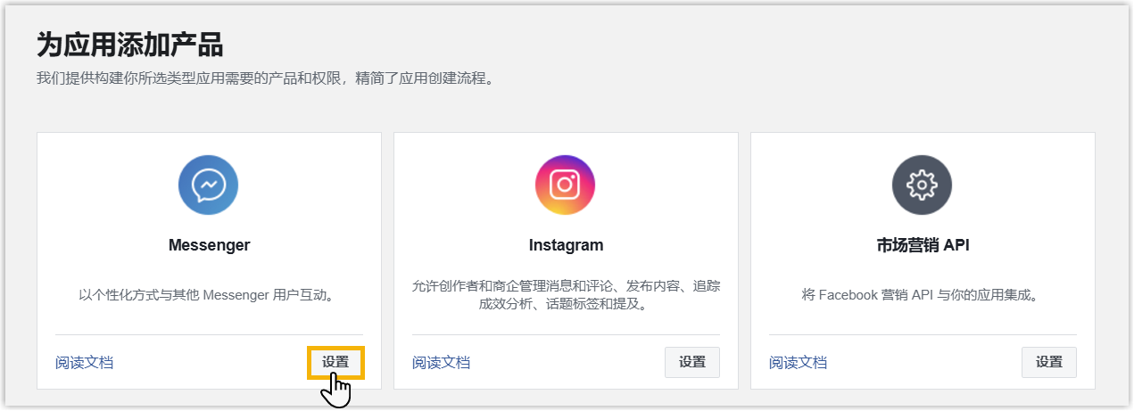 - 在 为应用添加产品 页面,点击 Messenger 上的