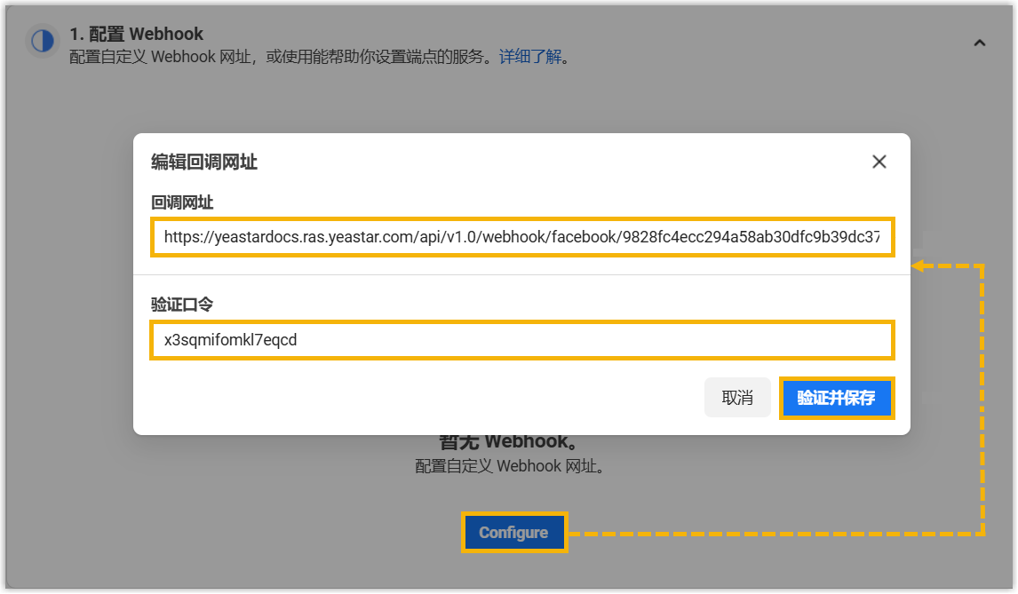 - 验证令牌:记下验证令牌,稍后在 Meta 开发者平台中需要用到。