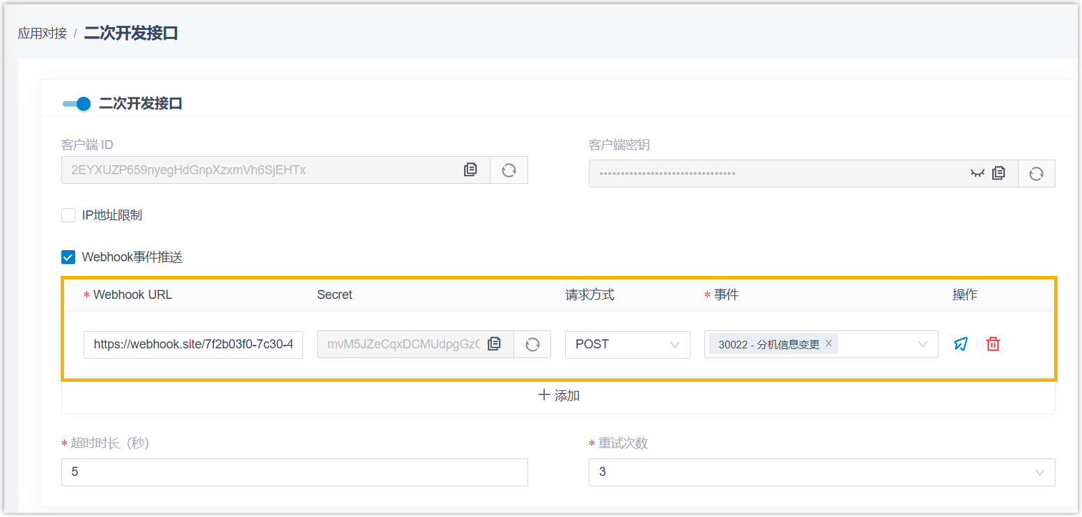 - 在 超时时长(秒)字段中,设置等待第三方应用的 HTTP 响应的最长时间,时间范围为 3 - 10