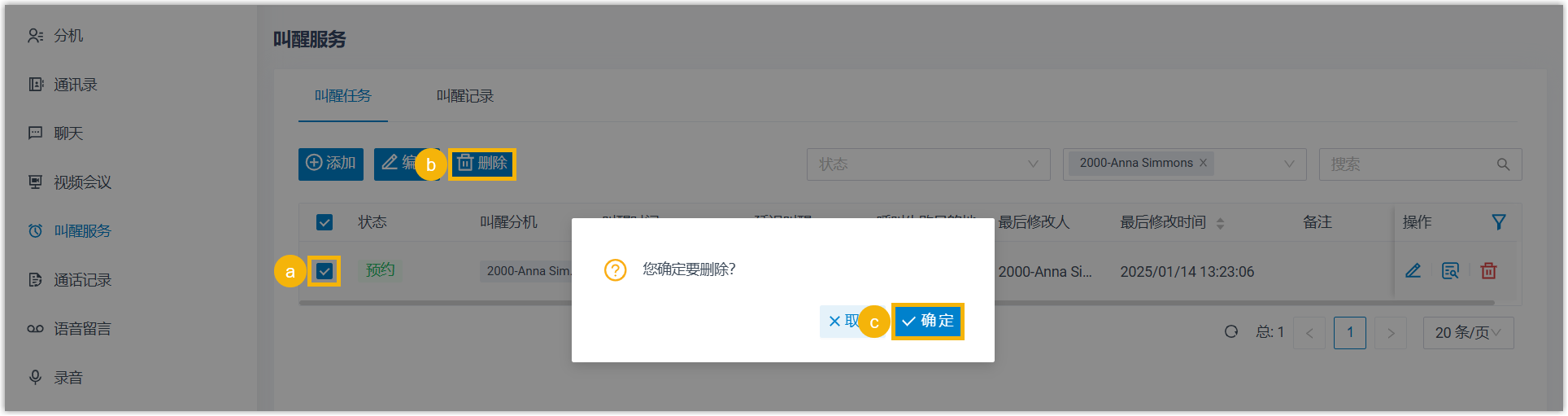 如果客人需要取消叫醒电话,授权分机用户可通过 Linkus 桌面端/网页端删除叫醒任务。客人也可通过客房话机自行删除。