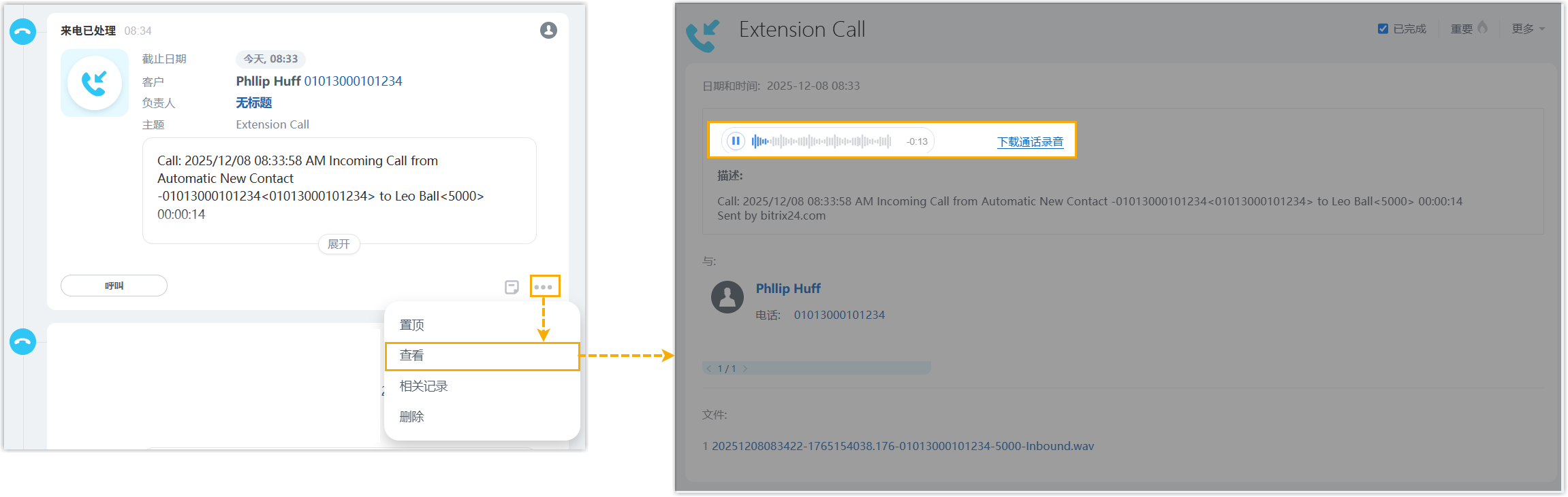 - 用户可以登录 Bitrix24,进入 或 ,进入联系人详情页查看通话记录。