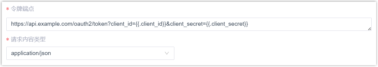 名称 为字段指定变量名称,模板中可根据需要引用此名称。 标题 为字段指定标题,将显示在输入框上方。 下拉选项值 如果 类型 设置为 下拉选项框,在此字段中输入选项。 注: 使用半角逗号,分隔多个选项,例如option1,option2。 - 配置 OAuth2 授权相关设置。