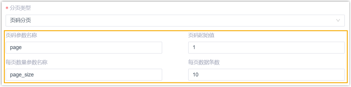 - 每页数量参数名称:填写接口请求中用于指定每页记录数量的参数名称。