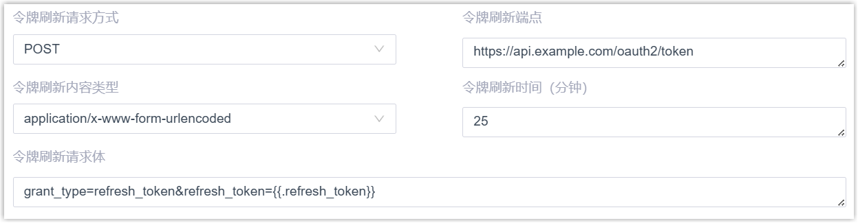 设置 说明 令牌刷新请求方式 刷新令牌 API 的 HTTP 请求方法。 令牌刷新端点 输入用于刷新访问令牌的 API 请求 URL。 令牌刷新内容类型 选择刷新令牌请求的内容类型。 令牌刷新时间 (分钟) 指定系统自动刷新访问令牌的时间间隔 (单位:分钟)。 注:-