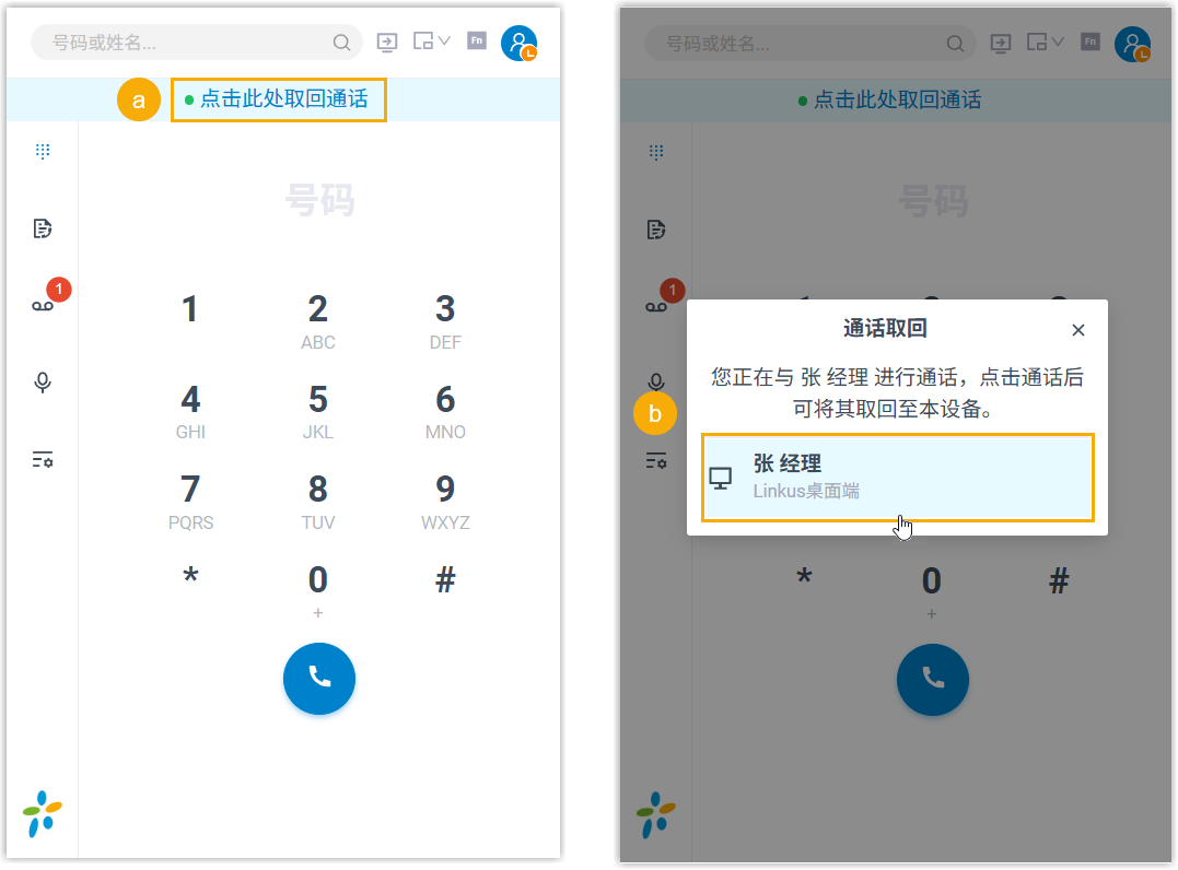 通话取回功能允许你将其他设备 (注册同一分机) 上正在进行的通话取回到 'Linkus for Dynamics 365' 上接听,取回过程中通话不中断。
