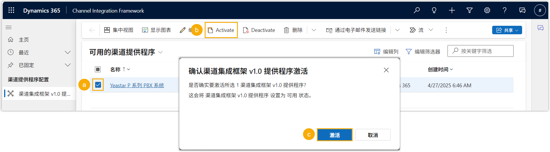 将其添加为渠道提供程序。这样,PBX 系统将作为插件嵌入到 Dynamics 365 中,用户可以直接在 Dynamics 365 界面内无缝访问和使用。