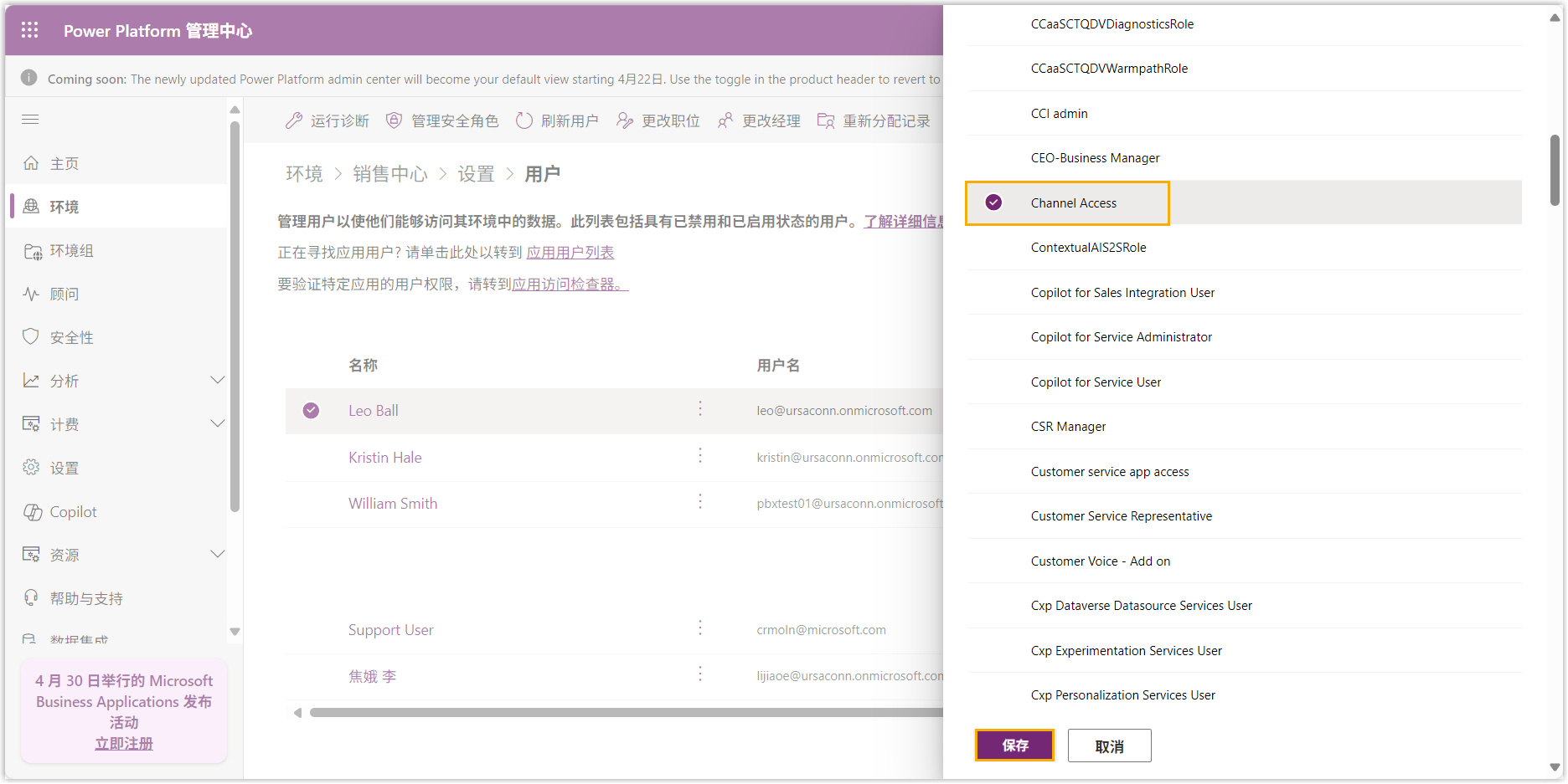 在添加渠道提供商后,你需要为特定用户分配 Channel Access 安全角色,从而确保渠道配置中选中的角色的用户可以访问该渠道。