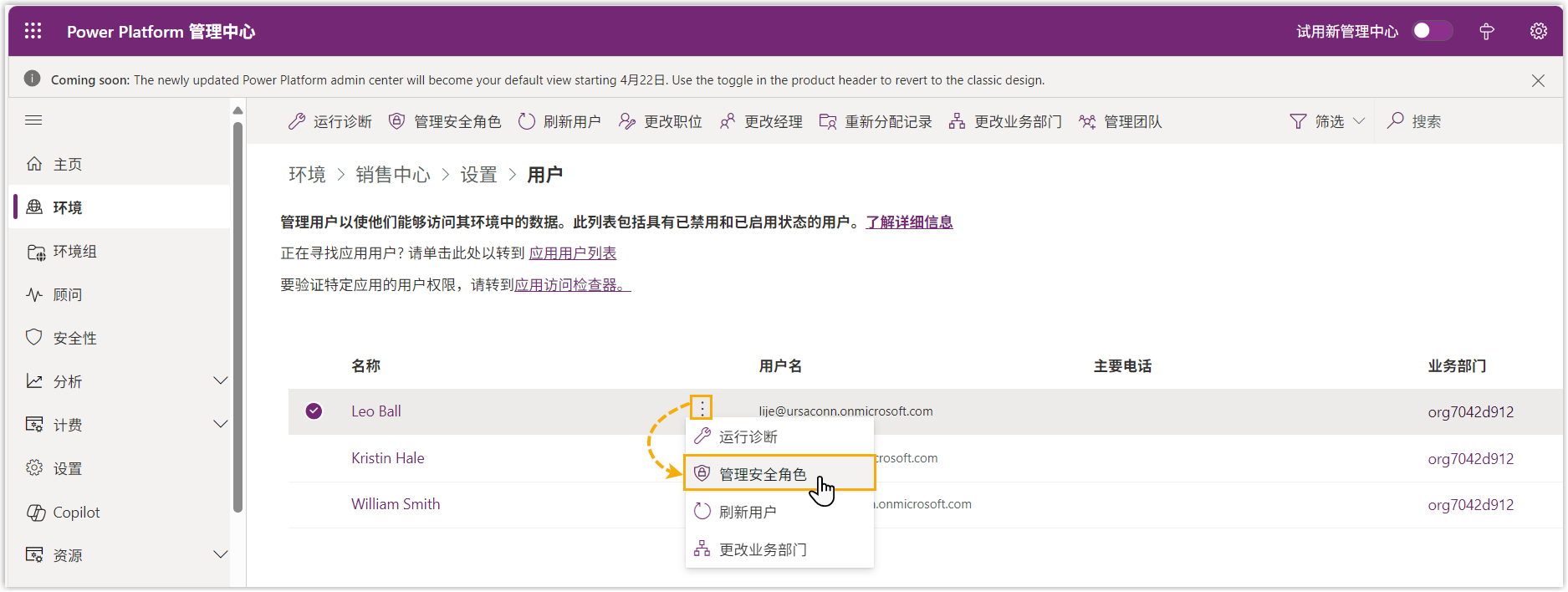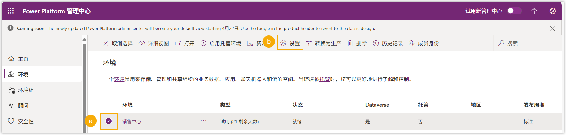 - 在 环境 页面,选择你的销售中心环境,然后点击顶部的