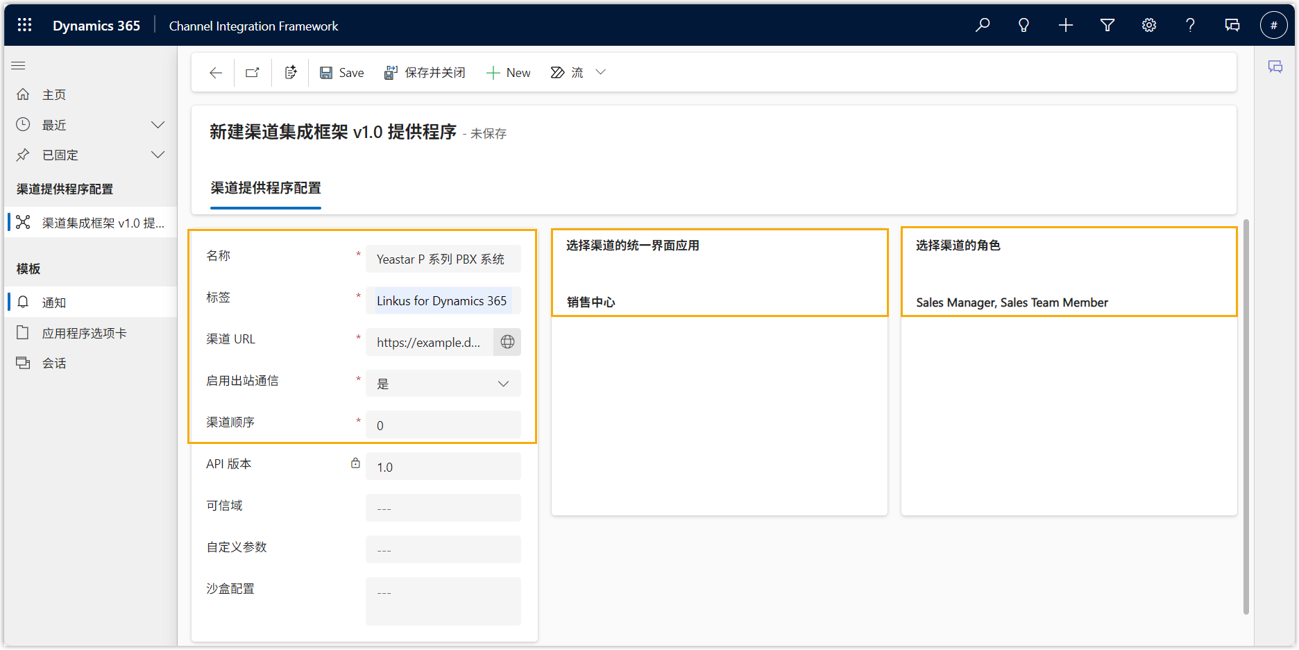 https://example.domain.yeastar.com/dyncrm?base=https://org1234d567.crm.dynamics.com启用出站通信 选择 是,以允许用户通过此渠道从 Dynamics 365 中呼出。 渠道顺序 指定此渠道在渠道列表中的显示优先级。 注: 数字越小,则优先级越高。选择渠道的统一界面应用 搜索并选择 销售中心,使该渠道在 Dynamics 365 CRM 界面中可用。 选择渠道的角色 选择允许访问该渠道的用户的角色。 - 在页面顶部,点击 保存并关闭。
