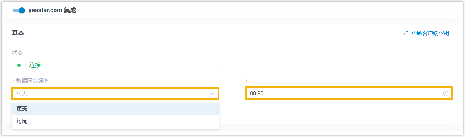 - 在 基本 栏,选择数据同步频率,并设置执行同步的时间。注: 建议在非办公时间同步用户。