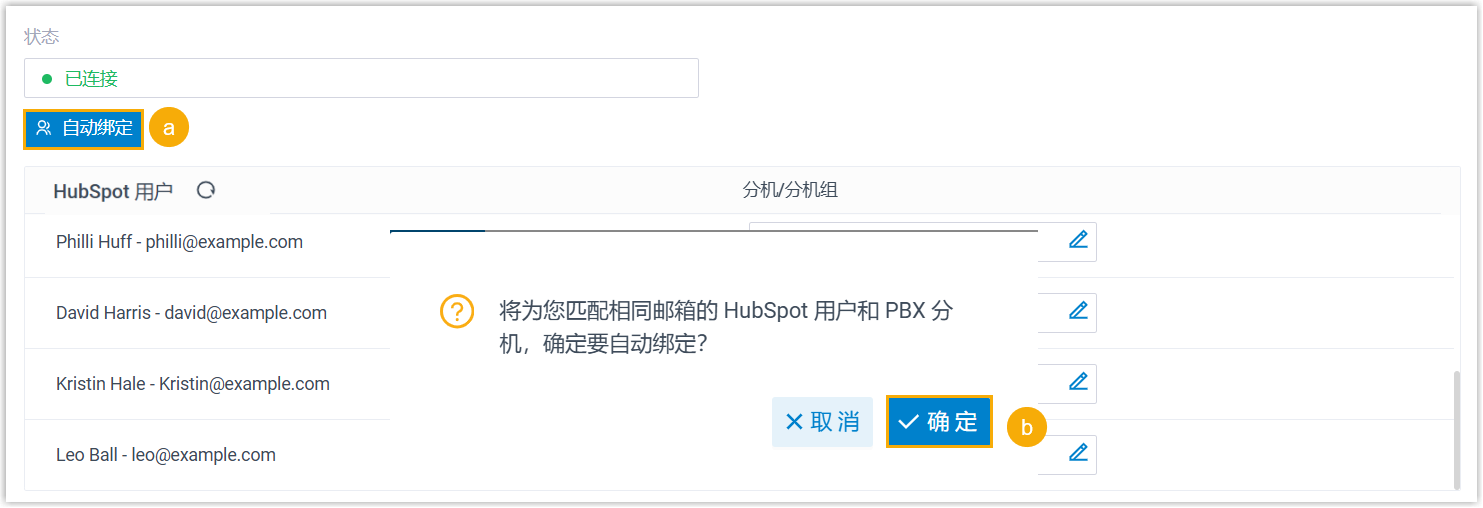 - 如果用户的 HubSpot 账号和 PBX 分机绑定了相同的电子邮箱地址,你可以设置自动绑定用户的 HubSpot 账号和