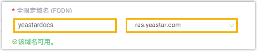 - 在 全限定域名 (FQDN) 栏,选择一个域名,然后输入主机名称。在本例中,选择域名 ras.yeastar.com,然后填写主机名称 yeastardocs,组成全域名 yeastardocs.ras.yeastar.com。注: 请确认清楚再设置主机名称。FQDN 设置保存后无法更改。
