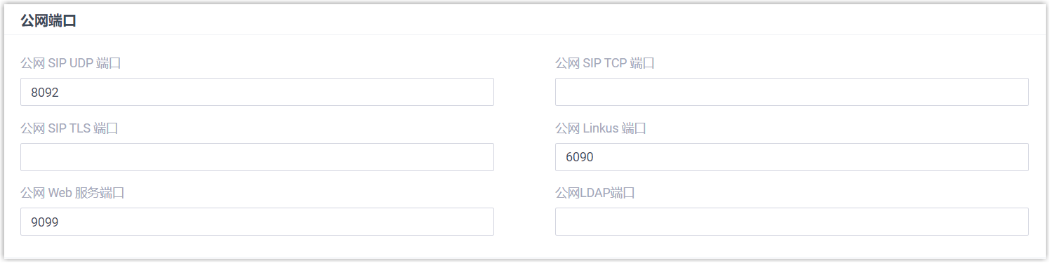 - 在 公网端口 栏,填写你在路由器上映射的外部端口。注: 公网 SIP UDP 端口、公网 SIP TCP 端口 和 公网 SIP TLS 端口 必须至少填写一个。