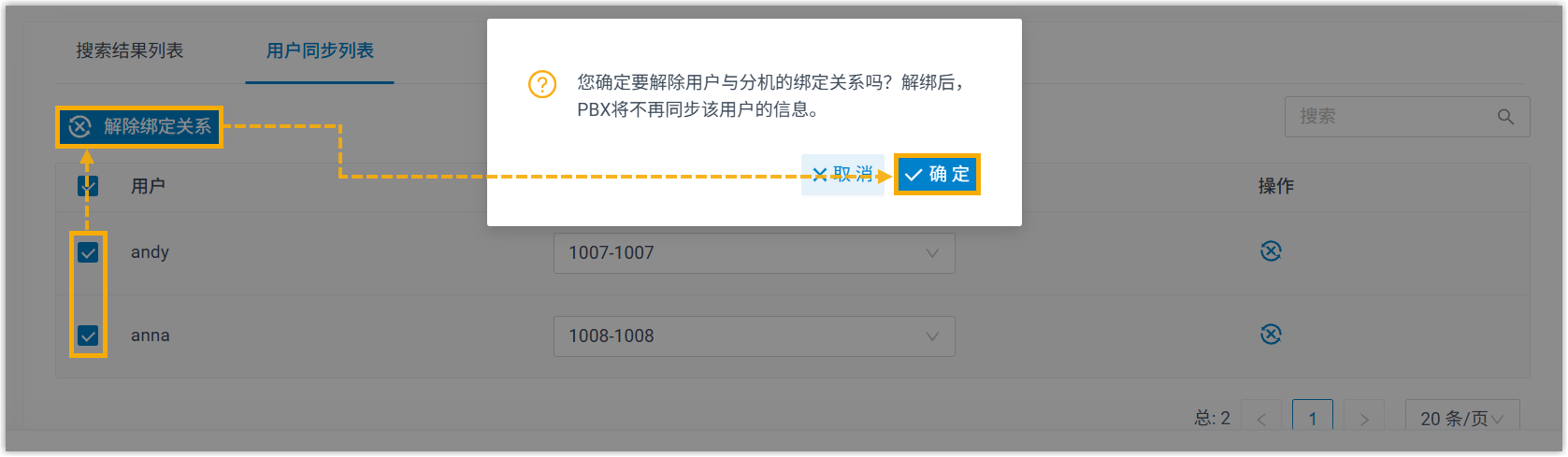 - 在 用户同步列表 中,从下拉列表中选中分机,与该用户绑定。注: 如果你想取消同步已选择的用户,执行以下操作: