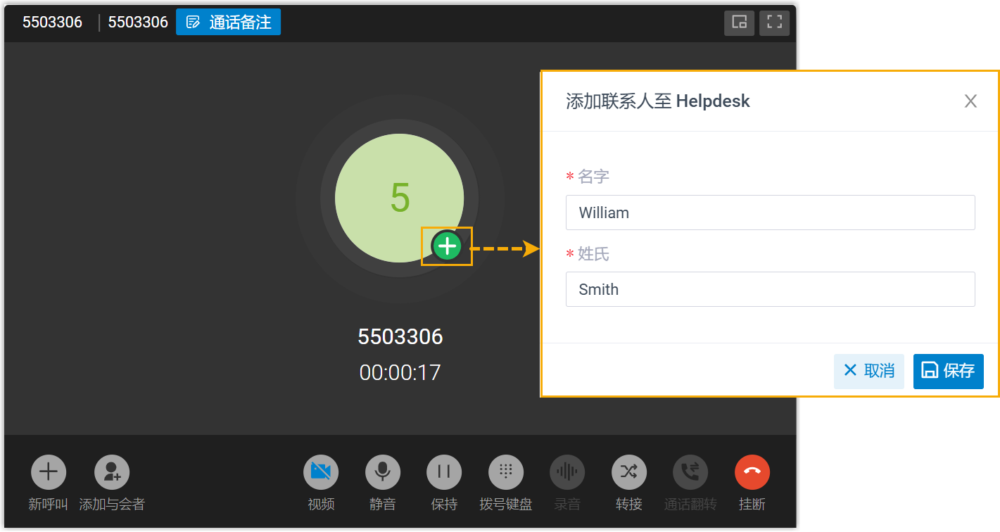 - 若设置了手动创建,分机用户可在与未知号码的通话中,将此未知号码添加为 Zoho Desk 上的联系人或线索。
