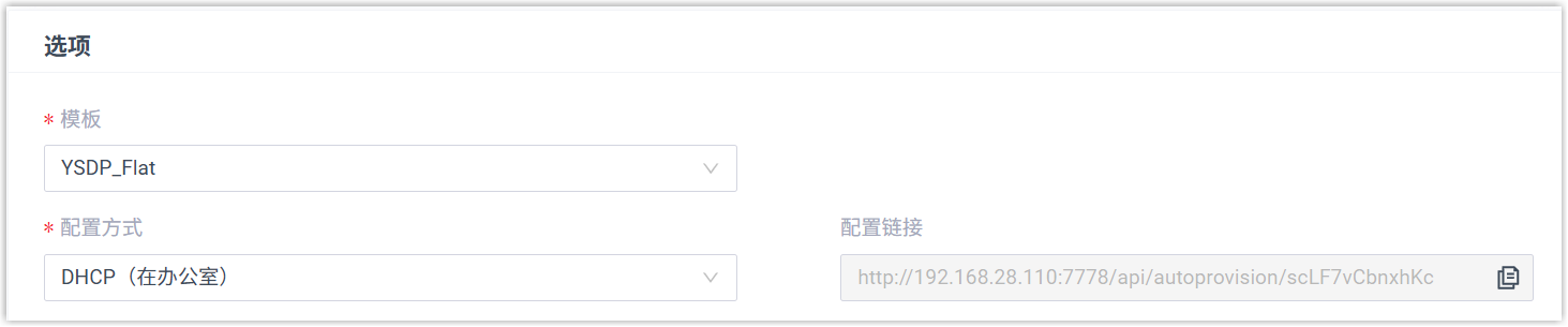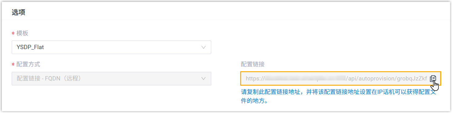 PBX 自动生成一个配置链接,显示在 配置链接 字段中。此链接指向话机配置文件所存储的位置。