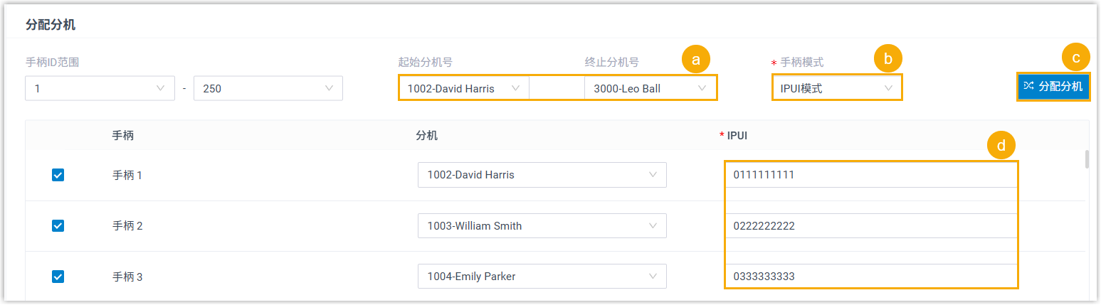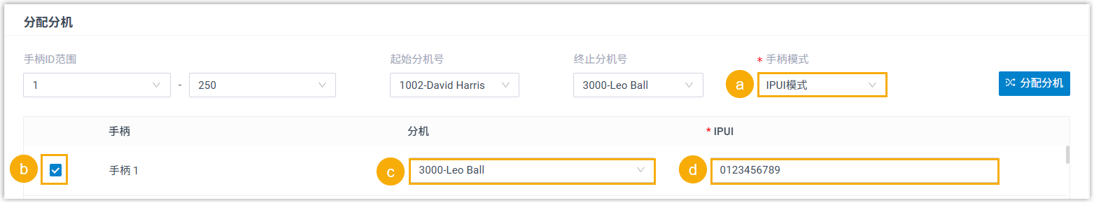 - 若使用 IPUI 模式,在 IPUI 字段中填入手柄的 IPUI 码。