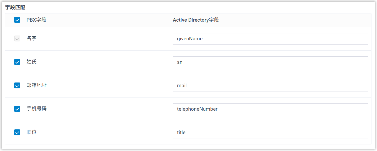 设置,支持 PBX 和 AD 用户属性之间的字段映射,以将指定的用户数据同步到