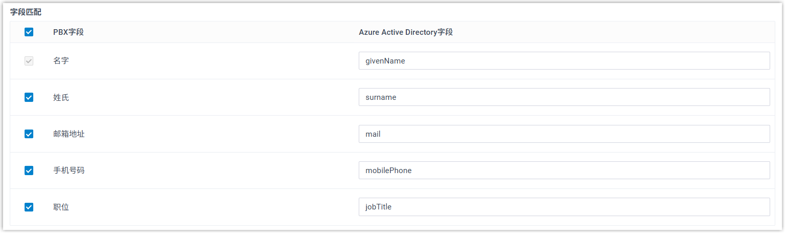 Entra ID 用户属性之间的字段映射,以将指定的用户数据同步到 PBX。