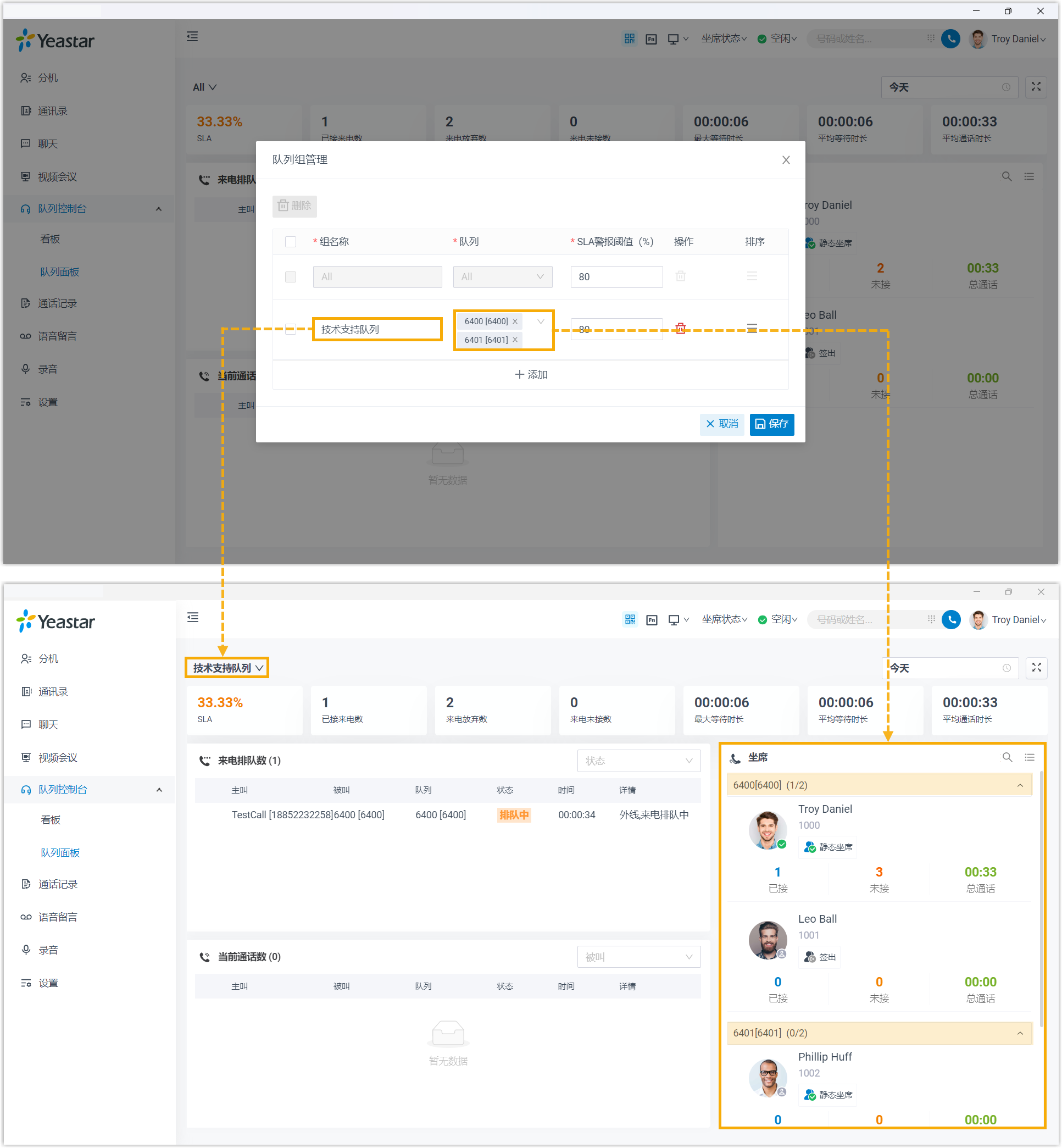 中集中监控多个队列的数据和通话。用户可以通过创建组,自定义要同时显示的队列。