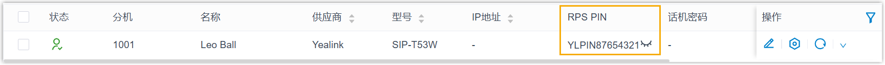 方式配置的亿联 (Yealink) 话机的 RPS PIN。注: 由于亿联 (Yealink) 已停止对部分机型的 RPS 支持,若要继续使用 RPS 功能,你需要将话机升级到其推荐的固件版本,并使用 RPS PIN 码进行配置。在此情况下,你可以在 PBX 管理网页上直接获取 RPS PIN 码,并将其输入到话机,以完成 RPS 配置流程。